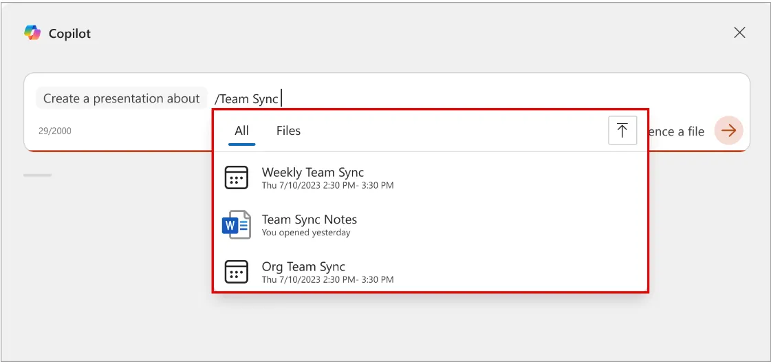Nutzer können künftig Teams-Meetings als Referenzquelle verwenden, wenn sie nach Dateien suchen, die Copilot zur Erstellung einer Präsentation nutzen soll.