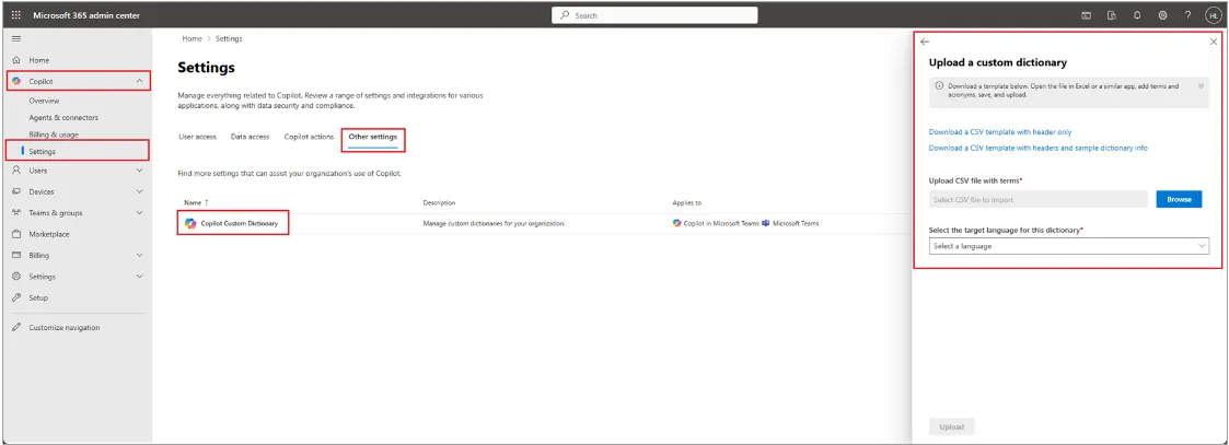 Auf der Copilot-Einstellungsseite im Admin Center können Mandantenadministratoren ein eigenes Wörterbuch hinterlegen. Dieses wird bei der automatischen Transkription von Teams-Besprechungen berücksichtigt und sorgt dafür, dass firmeninterne Begriffe, Abkürzungen oder Produktnamen korrekt erkannt und transkribiert werden.