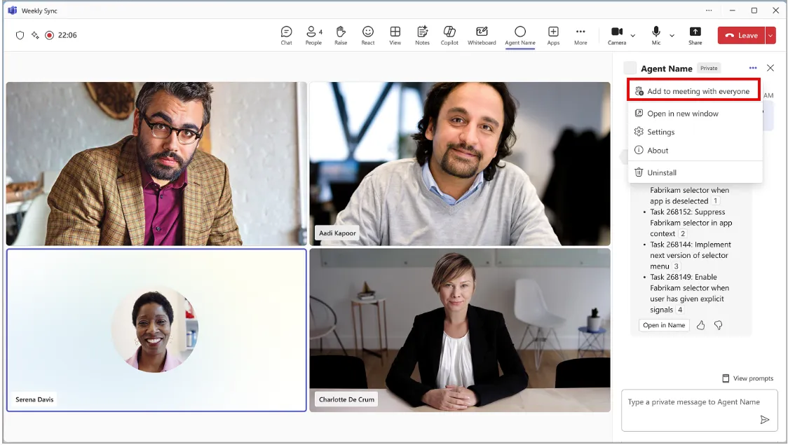 Nach dem Rollout stehen alle Agenten aus Microsoft 365 Copilot Chat und dem Microsoft Copilot Studio in Besprechungen und Anrufen zur Verfügung.